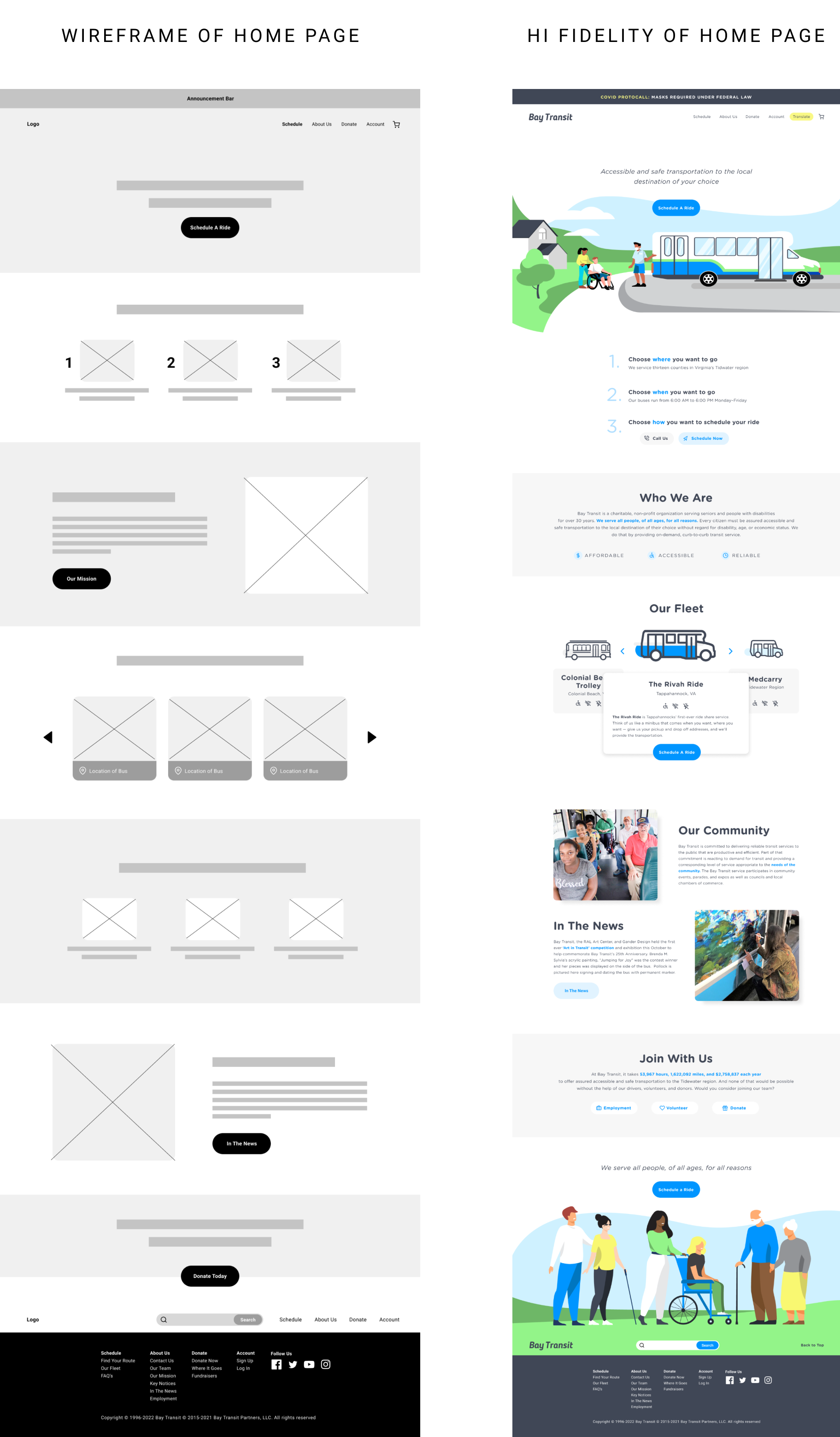 Based on my direct competitor research and feedback from interviews, what BayTransit was missing was the ability to schedule rides online and to donate to their mission. These are the major additions I implemented into their site re-design. You will also see a build out of their About Us and In The News page.