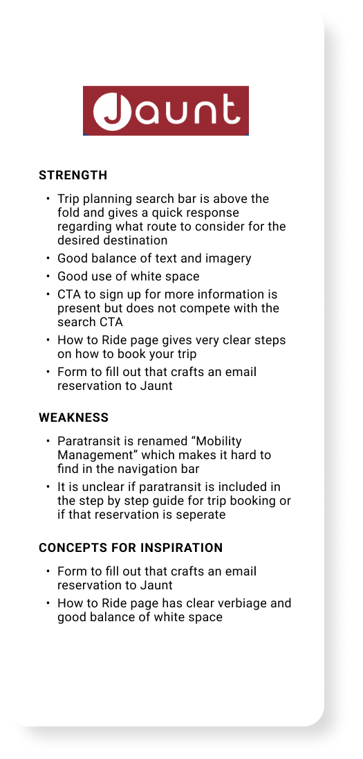 To begin testing my hypothesis, I wanted to compare how other Virginia public transportation and paratransit companies were getting their riders to book travel. I did this by completing a SWOT analysis of Bay Transit’s direct competitors to kick off the empathize phase.
